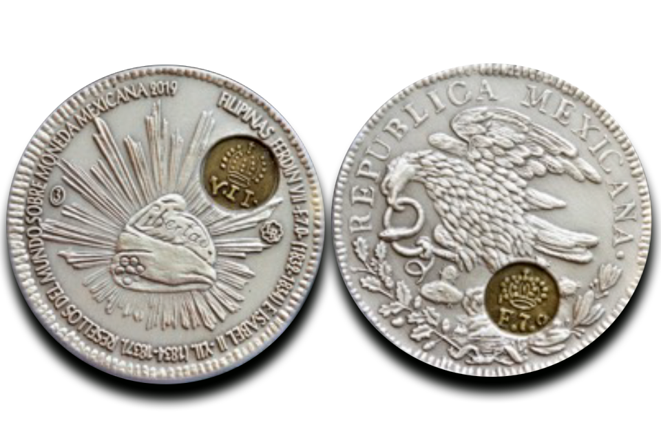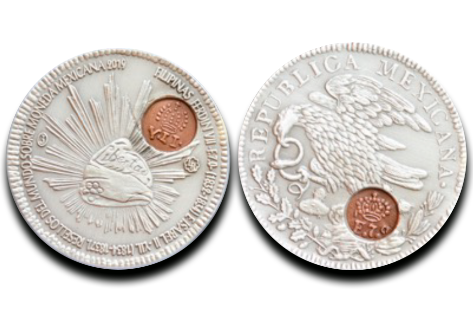 La presente medalla fue elaborada en los talleres de Fidias Arte encabezado por el Maestro Lorenzo Rafael por encargo y diseño de Del Bosque, Briggs & Bustos, la cual pertenece a la colección Resellos del Mundo sobre Moneda Mexicana siendo esta medalla la tercera de esta serie, en la que se emula una moneda de 8 Reales México 1824 de águila de perfil como pieza base que por ambas caras presenta resellos de filipinas, por anverso el correspondiente a Fernando VII colocado entre 1832-1834 y por reverso el de Isabel II de 1834-1837 que a su vez están sobre un inserto de un metal distinto al del resto de la pieza.