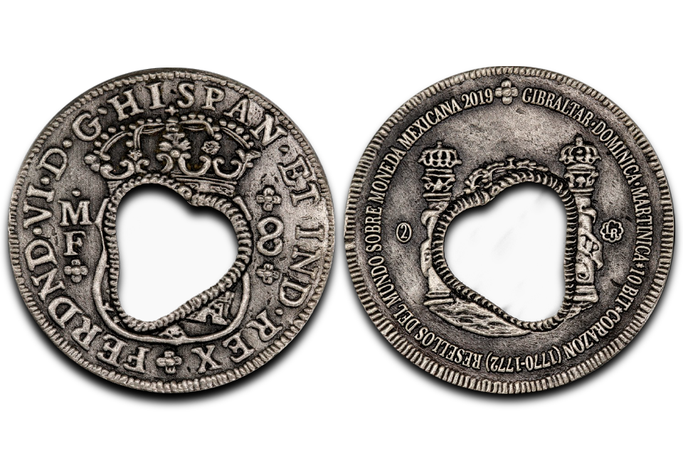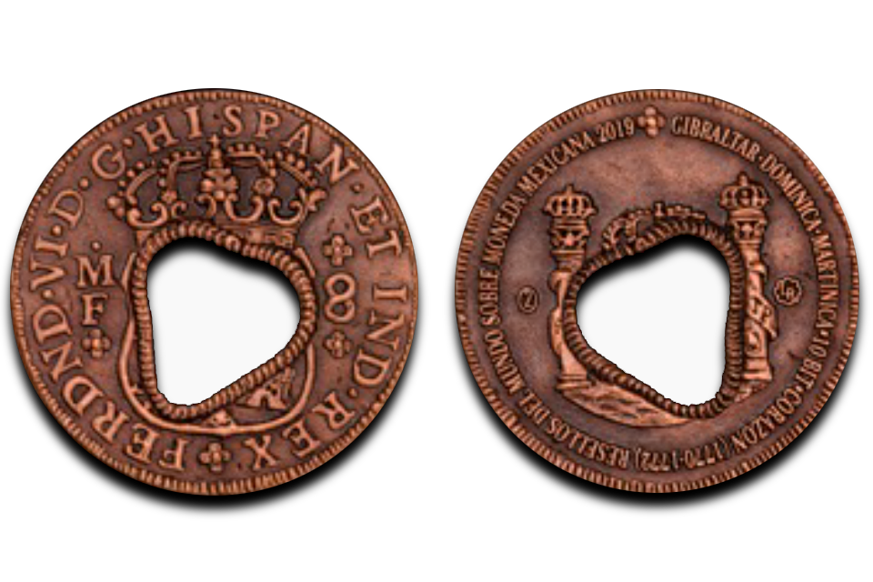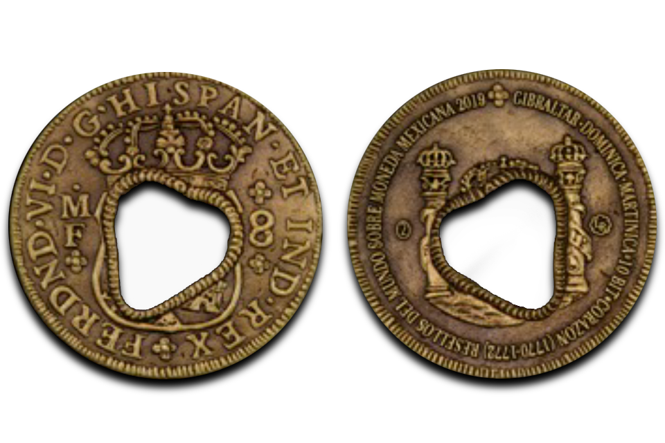 La presente medalla fue elaborada en los talleres de Fidias Arte encabezado por el Maestro Lorenzo Rafael por encargo y diseño de Del Bosque, Briggs & Bustos, la cual pertenece a la colección Resellos del Mundo sobre Moneda Mexicana siendo esta medalla la segunda de esta serie, en la que se emula una moneda de 8 Reales columnaria de Fernando VI como pieza base con resello en forma de corazón y con su interior hueco, ejecutado entre 1770-1772 en Dominica, Gibraltar.