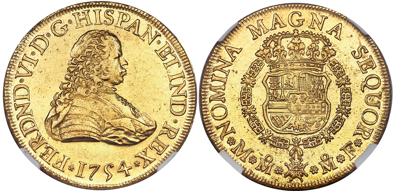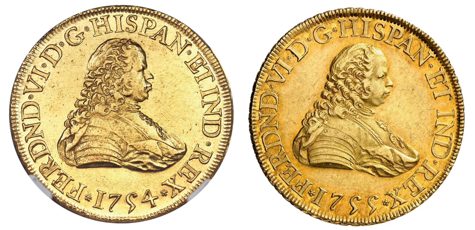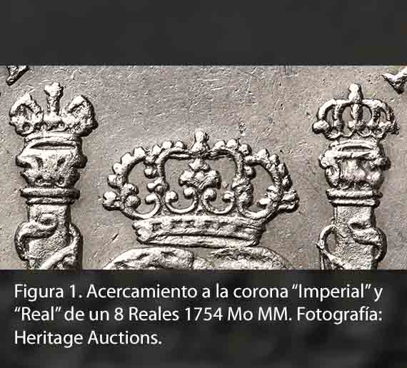 1754 resulta una fecha interesante y compleja para la Casa de Moneda de México, ya que durante este año además de haber un cambio de ensayador, se introdujeron ligeros cambios de diseño. Sin duda el más conocido es el cambio de Corona “Real” a “Imperial” sobre el pilar izquierdo de los Columnarios. La adecuación primeramente solo se realizó en piezas de 8 Reales, en 4 Reales sucedió al año siguiente y en las demás denominaciones hasta 1757, cosa que no ocurrió en ninguna de las otras cecas. Respecto al 8 Reales, referencias actualizadas consideran dentro del periodo de Fernando VI dos subtipos; aquellas acuñadas entre 1747-1754 con coronas reales, popularmente denominadas “coronas iguales” (KM# 104.1, A&C# 469-484) y las posteriores de 1754-1760 con corona Imperial y Real o “coronas distintas” (KM# 104.2, A&C# 485-497, Figura 1). Brad Yonaka en su obra “A Variety Guide of the Silver and Copper Coinage of the Mexico City Mint 1732-1771”, pag. 41-42, propone algunas teorías del porqué del cambió.