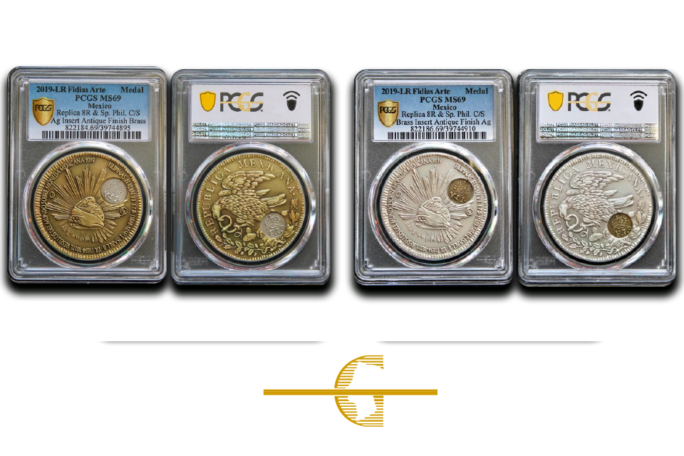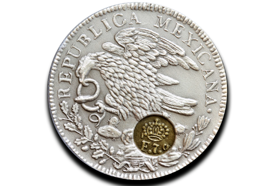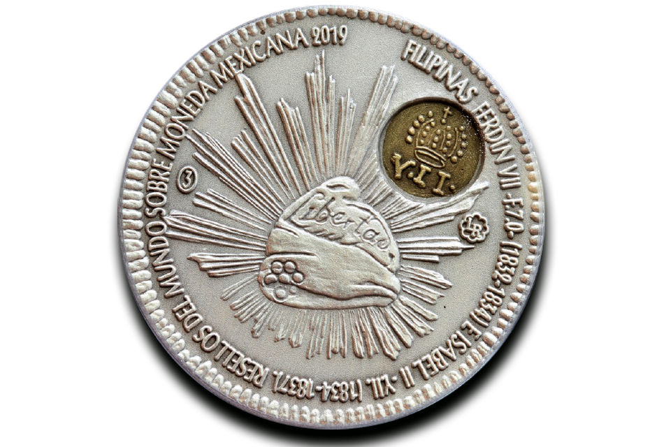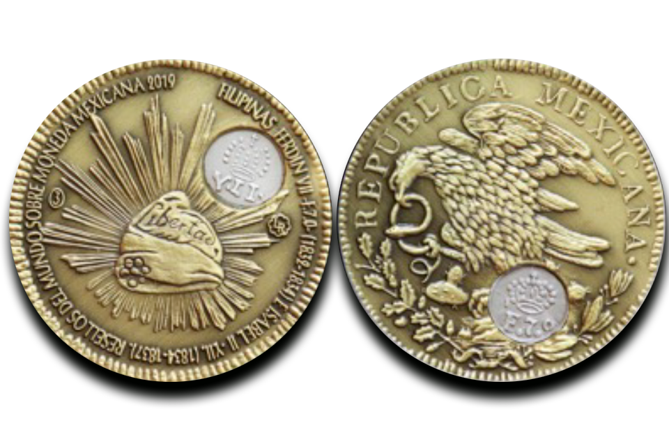 La presente medalla fue elaborada en los talleres de Fidias Arte encabezado por el Maestro Lorenzo Rafael por encargo y diseño de Del Bosque, Briggs & Bustos, la cual pertenece a la colección Resellos del Mundo sobre Moneda Mexicana siendo esta medalla la tercera de esta serie, en la que se emula una moneda de 8 Reales México 1824 de águila de perfil como pieza base que por ambas caras presenta resellos de filipinas, por anverso el correspondiente a Fernando VII colocado entre 1832-1834 y por reverso el de Isabel II de 1834-1837 que a su vez están sobre un inserto de un metal distinto al del resto de la pieza.