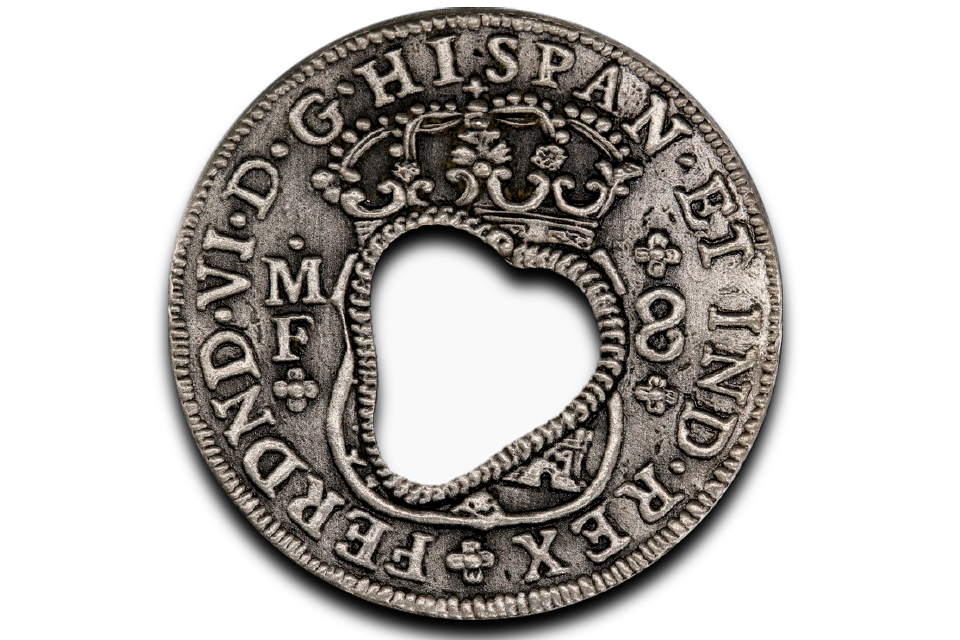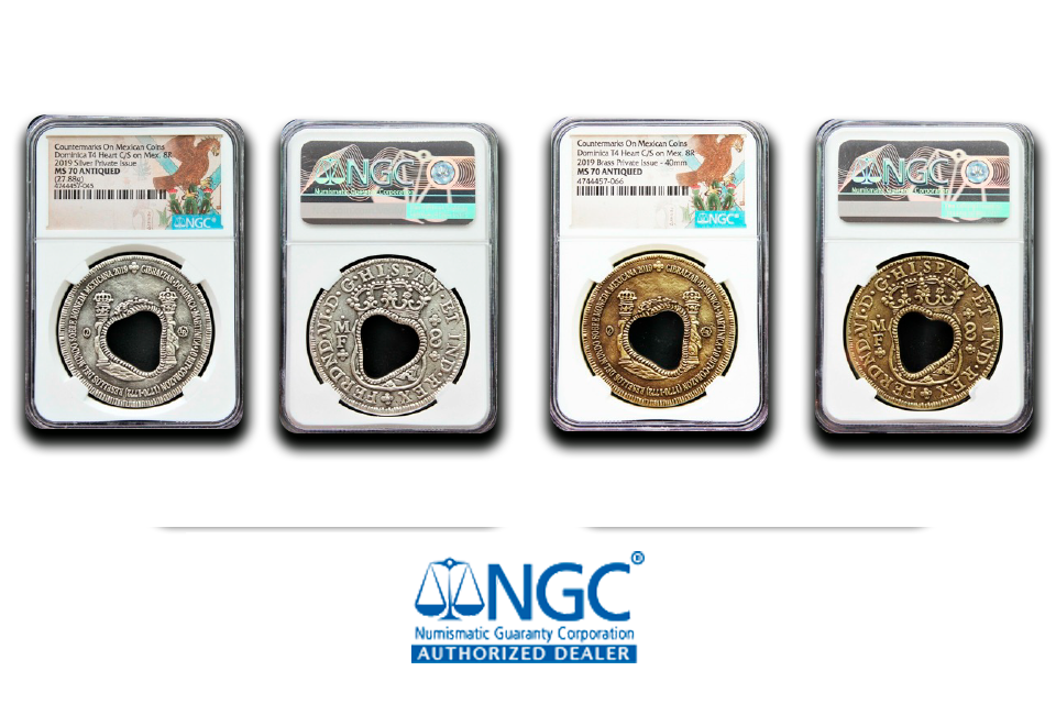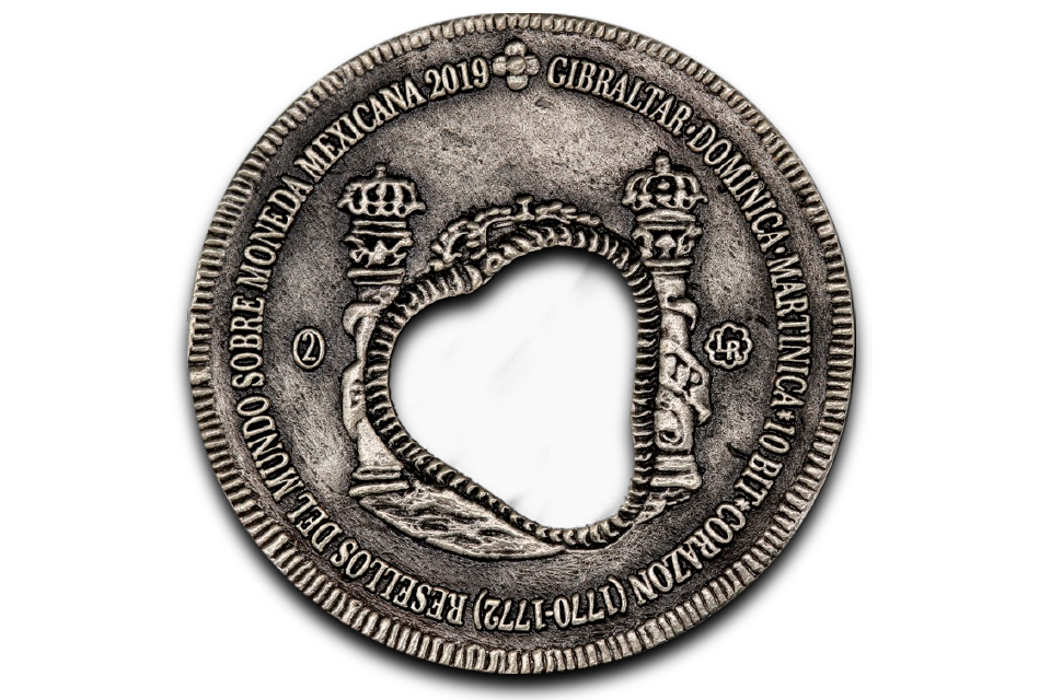 La presente medalla fue elaborada en los talleres de Fidias Arte encabezado por el Maestro Lorenzo Rafael por encargo y diseño de Del Bosque, Briggs & Bustos, la cual pertenece a la colección Resellos del Mundo sobre Moneda Mexicana siendo esta medalla la segunda de esta serie, en la que se emula una moneda de 8 Reales columnaria de Fernando VI como pieza base con resello en forma de corazón y con su interior hueco, ejecutado entre 1770-1772 en Dominica, Gibraltar.