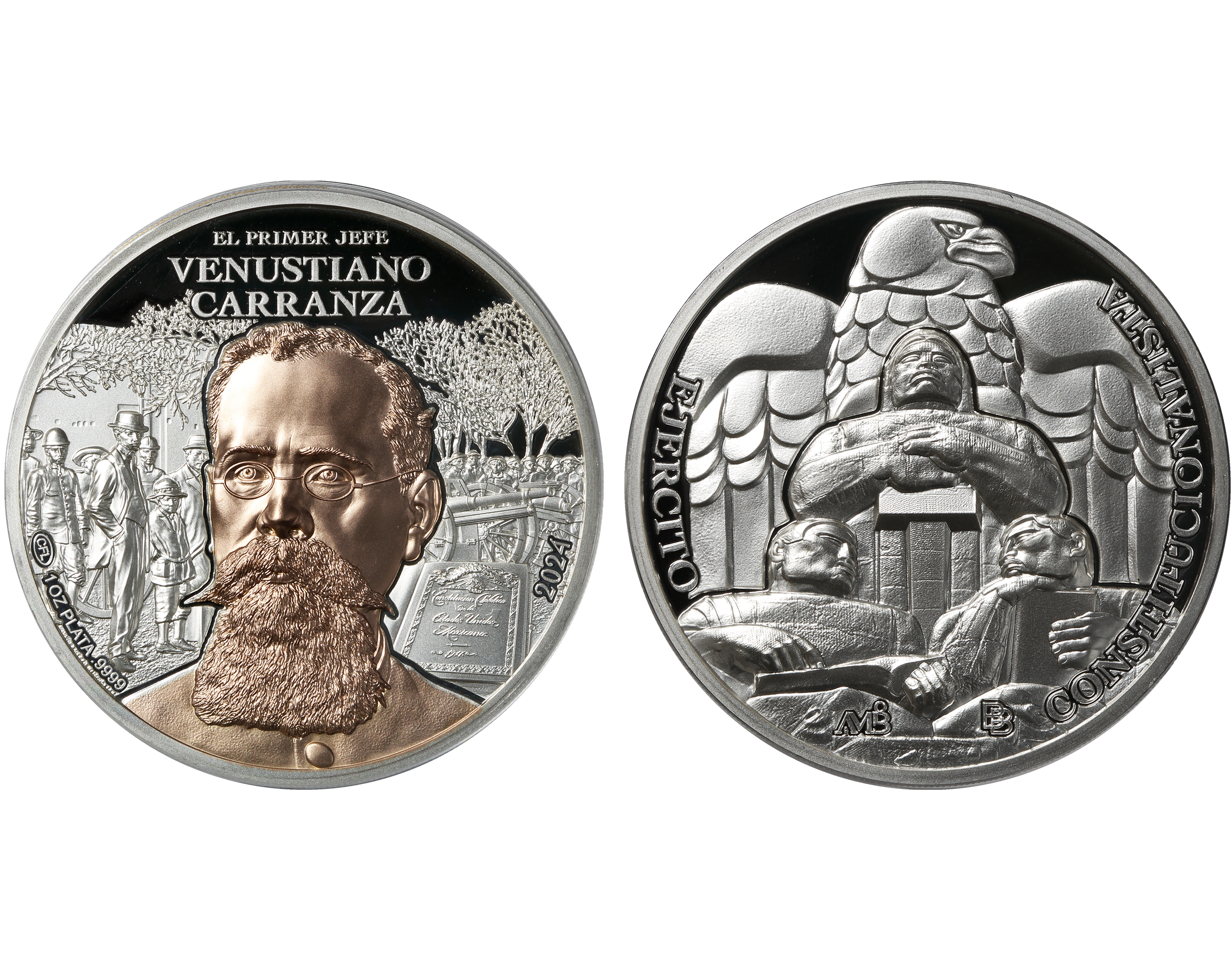 Presentamos una medalla de edición especial en honor a Venustiano Carranza, líder fundamental de la Revolución Mexicana y artífice de la Constitución de 1917. Esta pieza conmemora su legado como Primer Jefe del Ejército Constitucionalista y su compromiso con la legalidad y la justicia social en México.
